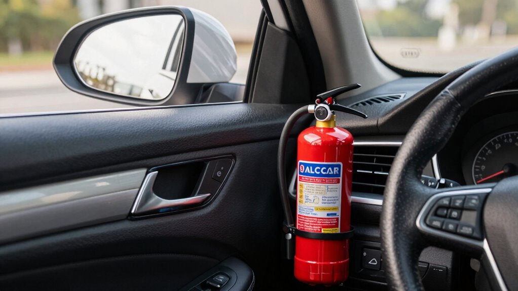 Ensuring your fire extinguisher is correctly placed can make all the difference in an emergency. Imagine you’re stuck in traffic when a small engine fire starts; quick access could save lives. By choosing a secure, visible spot—like the driver’s side door pocket—you’re prepared to act swiftly. Remember, proper placement isn’t just about convenience; it’s about safety. Take the time now to install it correctly, so you’re ready when every second counts.