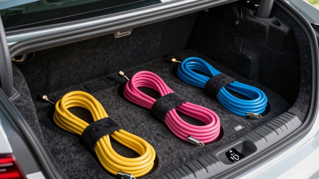 Taming your trunk’s tangled cords is like orchestrating a symphony—every cable in its place creates harmony. With the right organizers, quick-access strategies, and a bit of effort, you’ll keep your charging cords neat and ready to go. Imagine a clutter-free trunk where chaos is replaced by calm, and your tech is always at your fingertips. Don’t let mess hold you back—take control today and turn your trunk into a well-oiled charging station.