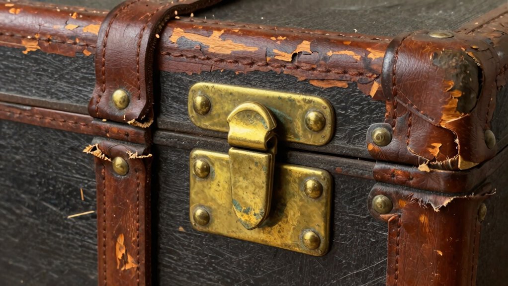 Like a vintage vinyl, hardware aging impacts both aesthetics and function. Over time, hardware develops a patina that can add character, but excessive corrosion from material deterioration makes it look cheap and may compromise strength. You’ll notice faded finishes, rust spots, or flaking paint, which diminish visual appeal. Aging hardware can also become harder to operate smoothly, affecting usability. Keep an eye out for these signs to assess whether the hardware’s age benefits or harms your steamer trunk.