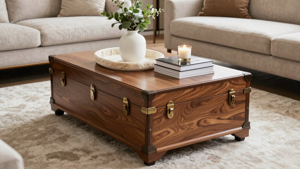 With the right styling, your trunk coffee table can instantly elevate your space’s vibe. Did you know that a well-styled coffee table can make a room feel 20% more inviting? Keep your accessories balanced, incorporate rich textures and colors, and stay consistent with your refreshes. By following these tips, you’ll create a chic, clutter-free centerpiece that impresses every guest and keeps your space looking effortlessly luxurious.