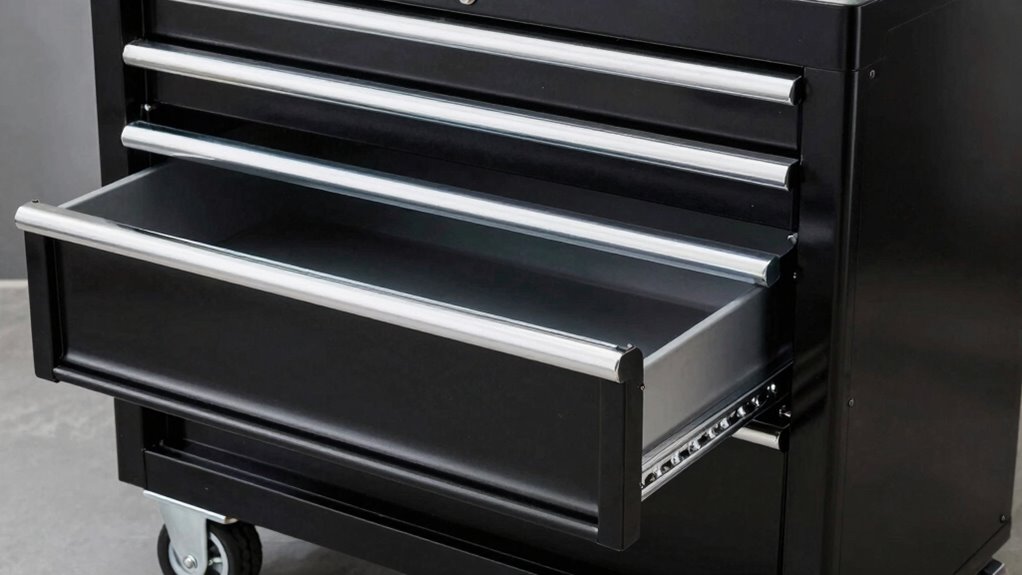 Drawer slides play a significant role in both the durability and ease of use of your rolling tool chest. The quality of the drawer mechanism directly affects how smoothly your drawers open and close, impacting user ergonomics and convenience. Well-designed slides reduce friction, prevent sticking, and lessen wear over time, ensuring your tools stay accessible longer. Consider the following:
