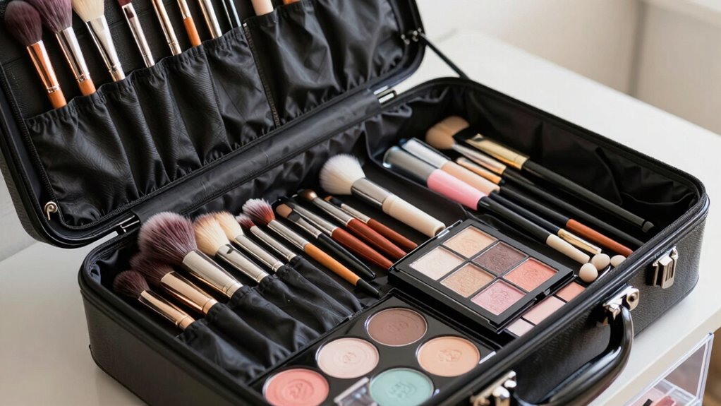 Since your makeup collection can change frequently, adjustable dividers give you the flexibility to customize your storage. With customizable compartments, you can easily resize or reposition the flexible dividers to fit different brushes and tools. This adaptability guarantees your brushes stay in place and are protected from damage or clutter. Whether you acquire new brushes or need to reorganize, you can quickly modify the layout without buying new containers. The flexible dividers allow you to create specific sections for different brush sizes, making your train case more efficient and organized. This way, your brushes are always accessible, neatly separated, and secure during travel or daily use. Adjustable dividers truly make your makeup storage versatile, preventing messes and helping you find what you need instantly.