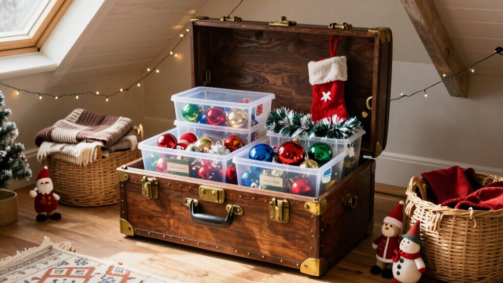 Think of your decor trunks as eco-friendly treasure chests in a sustainable storage journey. Yes, there are eco-friendly options—think recycled wood or biodegradable materials—that turn your storage into a conscious choice. By recycling decor and choosing sustainable storage, you’re not just preserving your holiday spirit but also protecting the planet. These eco-trunks keep your decorations safe while helping you reduce waste and embrace greener living.