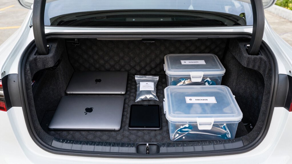 Think of your car trunk as a treasure chest—protecting your electronics is key to keeping your valuable items safe. By choosing the right storage methods, sealing devices properly, and monitoring moisture levels, you prevent corrosion like a shield deflects arrows. Stay vigilant and organized, and your electronics will remain dry and functional, just like a lighthouse standing tall against stormy seas. Keep these tips in mind, and your devices will thank you for it.