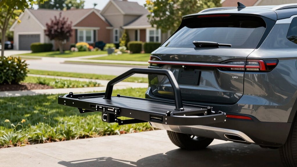 Adding the right accessories can considerably boost the security, stability, and convenience of your enclosed hitch cargo carrier. Locks, security cables, and reflectors are essential for safeguarding your belongings and enhancing visibility, especially at night. Using a cargo net or bungee cords helps organize items and prevents shifting during transit, reducing noise and potential damage. Installing a hitch stabilizer minimizes sway and rattling, making driving safer and more comfortable. Reflective strips or LED lighting accessories increase visibility, alerting other drivers to your carrier’s presence in low-light conditions. These accessories not only improve safety but also help you secure valuable items from theft when you’re away. Carefully selecting these extras ensures your cargo carrier functions at its best and keeps your gear safe and stable on the road.