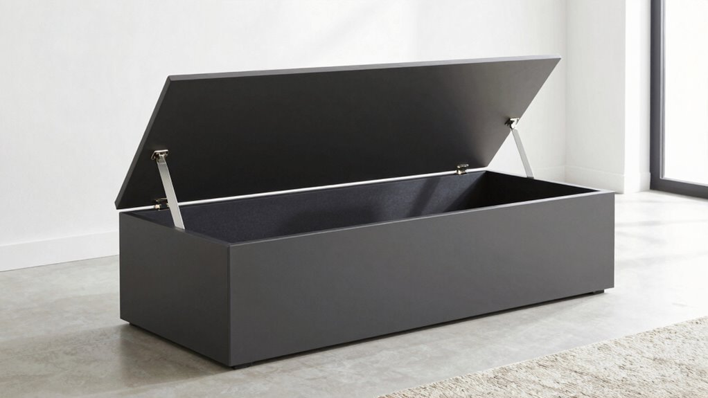 A lift top storage bench can typically support between 200 to 400 pounds, depending on its build quality and materials. I always recommend checking the manufacturer’s specifications for exact weight limits, as exceeding them could compromise safety. It’s a gentle reminder that, like in life, knowing your limits guarantees longevity and peace of mind. So, use your bench wisely, respecting its capacity, and it’ll serve you well for years to come.