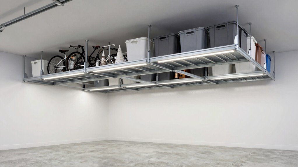 - Top-rated garage ceiling storage racks feature heavy-duty steel construction with capacities up to 1200 lbs for heavy item storage.