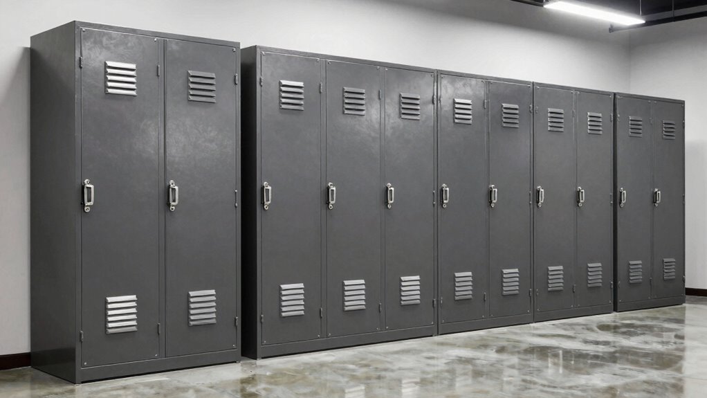 Choosing a heavy-duty metal storage cabinet hinges on the durability of its materials, as these determine how well the unit withstands daily wear, moisture, and heavy loads. High-quality steel, like cold-rolled or reinforced steel, offers essential strength and resilience. The surface coating, whether powder coating or eco-friendly paint, protects against scratches, rust, and corrosion, extending the cabinet’s lifespan. Reinforced steel frames and thick doors boost structural integrity, enabling the cabinet to support substantial weight without warping. Many heavy-duty models incorporate drainage holes and ventilation features to prevent moisture buildup, further preserving material integrity. Selecting materials with high tensile strength and corrosion resistance guarantees your cabinet remains functional and visually appealing, even in demanding environments or with frequent use.
