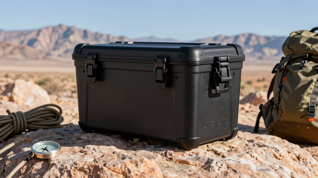 Choosing a storage box that can keep your gear dry and clean is vital for any overland adventure, especially in unpredictable weather. Waterproof and dustproof features ensure your items stay protected in harsh outdoor environments. Seals made from environmental protection-grade materials provide a super sealing capability, preventing water and dust from entering. Rubber gaskets and O-ring seals are commonly used to create airtight closures that boost waterproof and dustproof performance. When selecting a box, look for IP ratings like IP65, which indicate resistance to water jets and dust. Proper sealing mechanisms are fundamental for maintaining the integrity of your gear during extreme weather and rugged terrain. These features give me peace of mind, knowing my equipment stays dry, clean, and ready for use no matter the conditions.