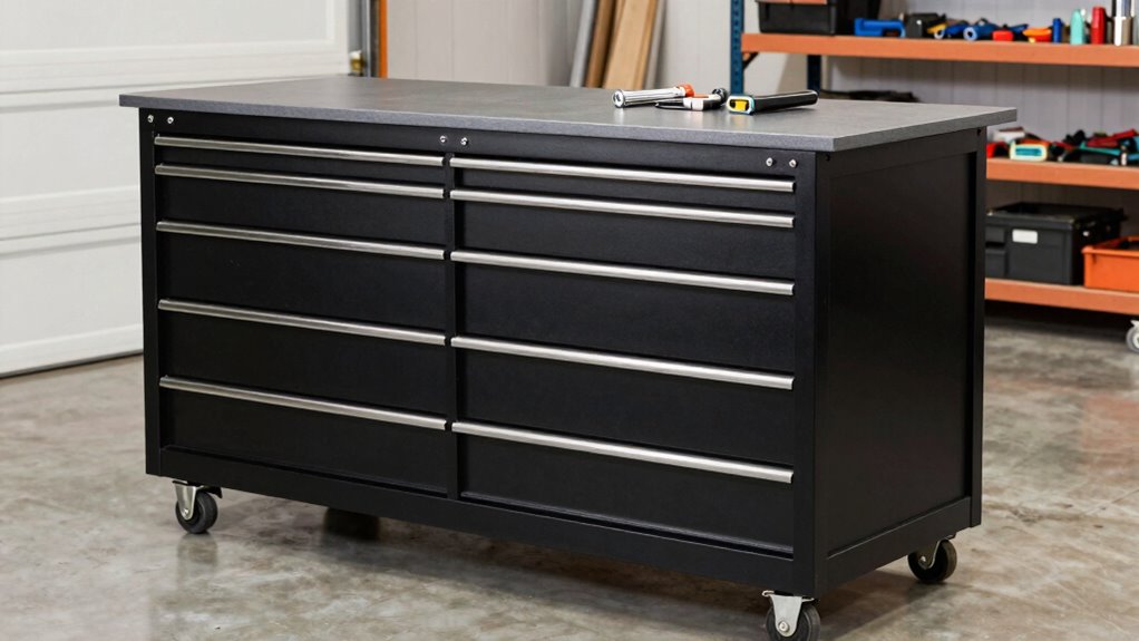 Choosing the right overall size for a rolling workbench with drawers is key to creating an efficient workspace. The size, including length, width, and height, impacts both storage capacity and usability. A larger workbench offers more surface area for projects and extra storage but can take up significant space and be harder to maneuver. Conversely, a compact-sized workbench suits smaller workshops or tight spaces, making it easier to move around. It’s also vital to consider the height to guarantee ergonomic comfort, whether you’re standing or sitting. Finally, check the total footprint to make sure it fits well within your workspace without obstructing movement or workflow. Selecting the right size helps balance functionality, comfort, and space efficiency.