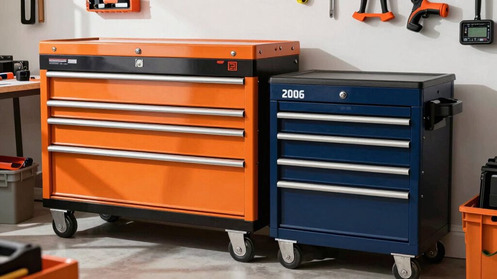 Choosing the right tool chest or cabinet combo hinges on understanding your storage capacity needs. I recommend first evaluating the total volume of space required, whether in cubic inches or liters, to comfortably fit all your tools. Think about the number and size of drawers needed to organize different tools and accessories efficiently. If portability and security matter, consider units with lockable compartments or removable trays. Also, check the weight capacity of each drawer and the overall cabinet to ensure it can handle your heaviest tools safely. Finally, plan for future growth by selecting a model with extra drawers or modular features, so your storage can expand as your collection grows. Proper planning ensures your tools stay organized and accessible.