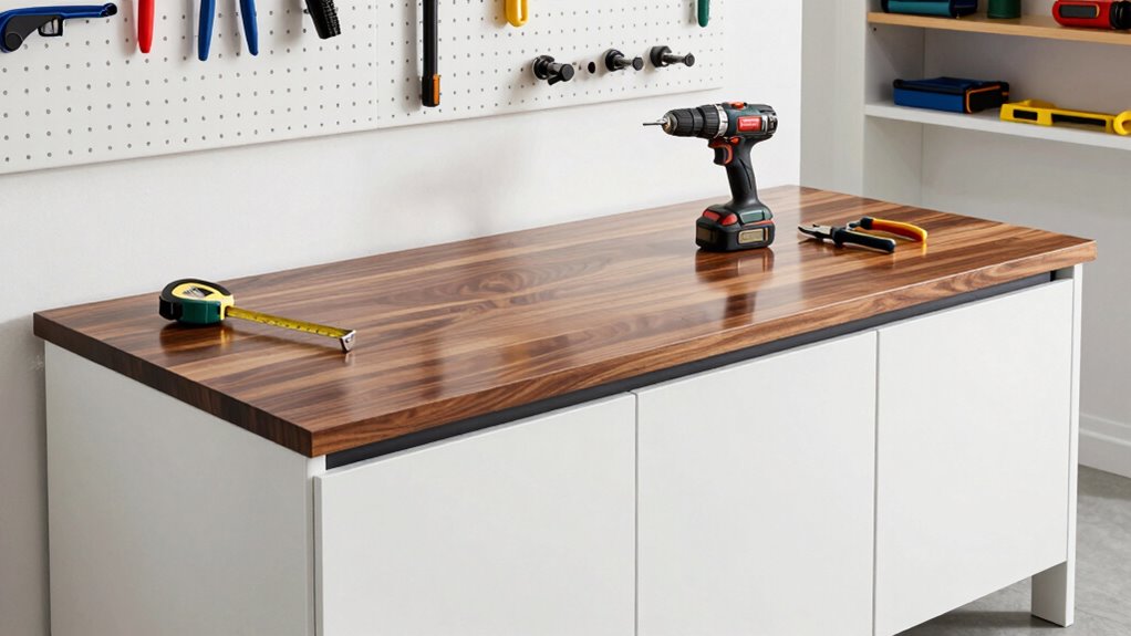 Choosing a workbench with storage cabinets can be straightforward or complicated, depending on its assembly complexity. The number of components and how detailed the instructions are directly affect setup time and effort. Modular or customizable designs may require extra steps to guarantee proper fitting and secure attachment, which can be challenging. Features like pre-drilled holes, clear labeling, and detailed instructions make assembly easier and quicker. Some workbenches come with online tutorials or customer support, which can be a lifesaver during tricky steps. However, furniture with many small parts or complex locking mechanisms can increase the risk of errors and extend the assembly process. Ultimately, considering how simple or complicated the assembly is helps you choose a workbench that fits your skill level and time constraints.