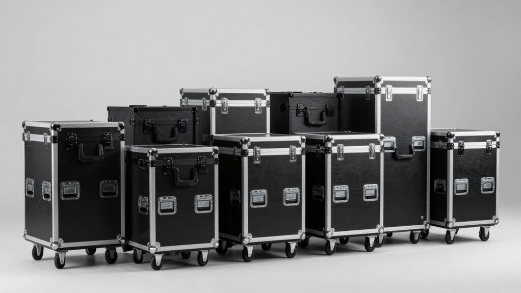 When choosing a rolling lighting equipment case, I consider factors like size to guarantee it fits my gear and is compatible with my setup. I also look at durability and materials to protect my equipment during transport, along with mobility features like wheels and handles for easy maneuvering. Finally, security measures and flexible storage options help me keep everything organized and safe on the go.