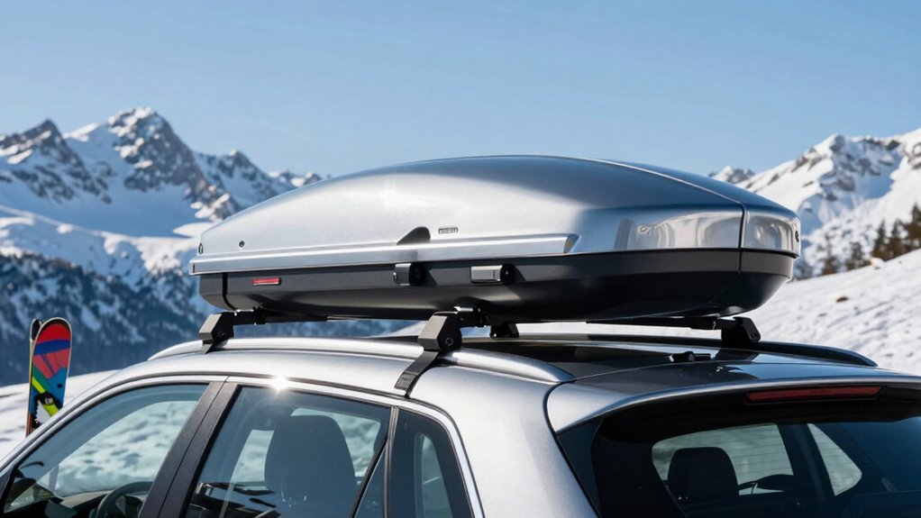 Think of these cargo boxes like a knight’s armor, shielding your gear from harsh elements. They’re highly weather-resistant, even in heavy snow or rain. Most are made from durable, waterproof materials with tight seals that keep moisture out. While no box is entirely invincible, I’ve found that quality designs hold up well against the elements, ensuring your skis stay dry and protected no matter the storm outside.